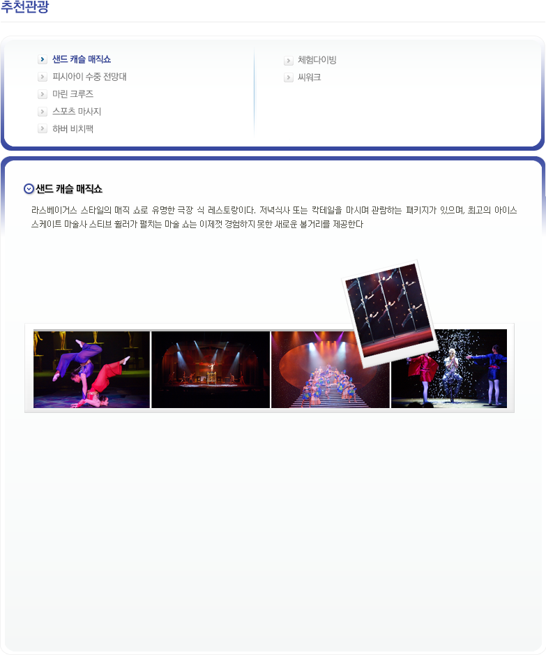 샌드 캐슬 매직쇼 피시아이 수중 전망대 마린 크루즈 스포츠 마사지 하버 비치백 체험다이빙 씨워크 자료출처 : 괌 관광청