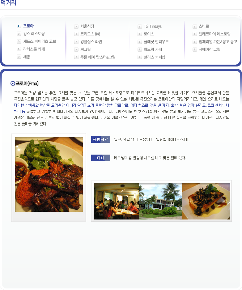프로아 킹스 레스토랑 제프스 파이리츠 코브 라테스톤 카페 세종 서울식당 코리도스 848 엉클심스 라면 씨그릴 투몬 베이 랍스&그릴 TGI 로이스 플래닛 커피샵 하드락 카페 셜리스 커피샵 스바로 텐테코마이 레스토랑 임페리얼 가든 & 몽고몽고 자메이칸 그릴 자료출처 : 괌 관광청
