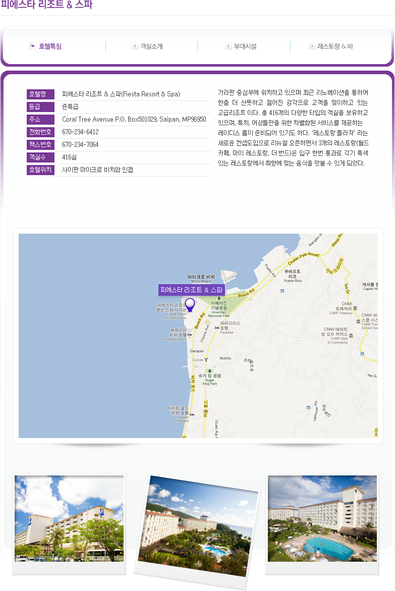 호텔특징 객실소개 부대시설 레스토랑바 자료출처 : 사이판 관광청