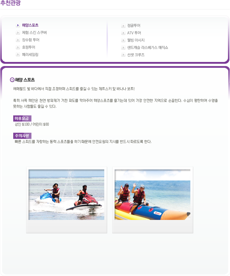 해양스포츠 체험스킨스쿠버 잠수함투어 호핑투어 페러세일링 정글투어 ATV투어 웰빙마사지 샌드캐슬 라스베가스 매직쇼 선셋크루즈 자료출처 : 사이판 관광청